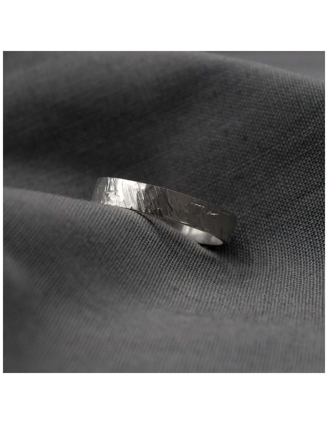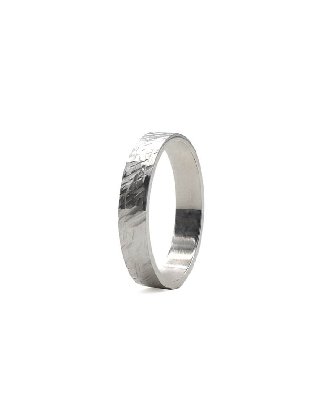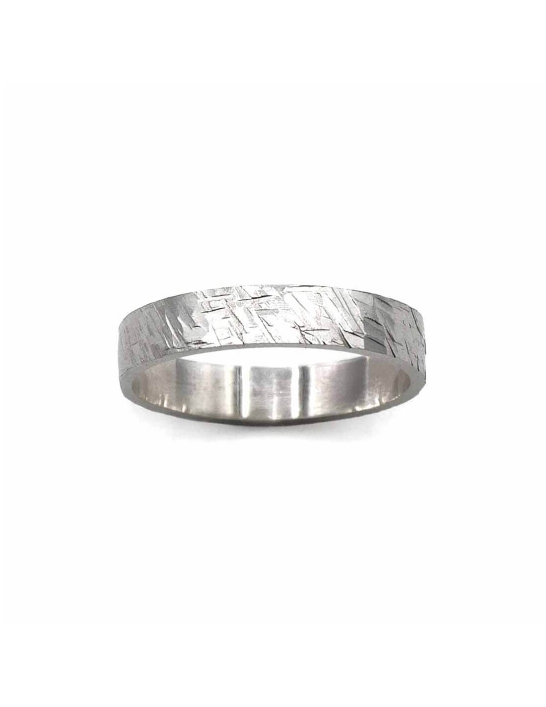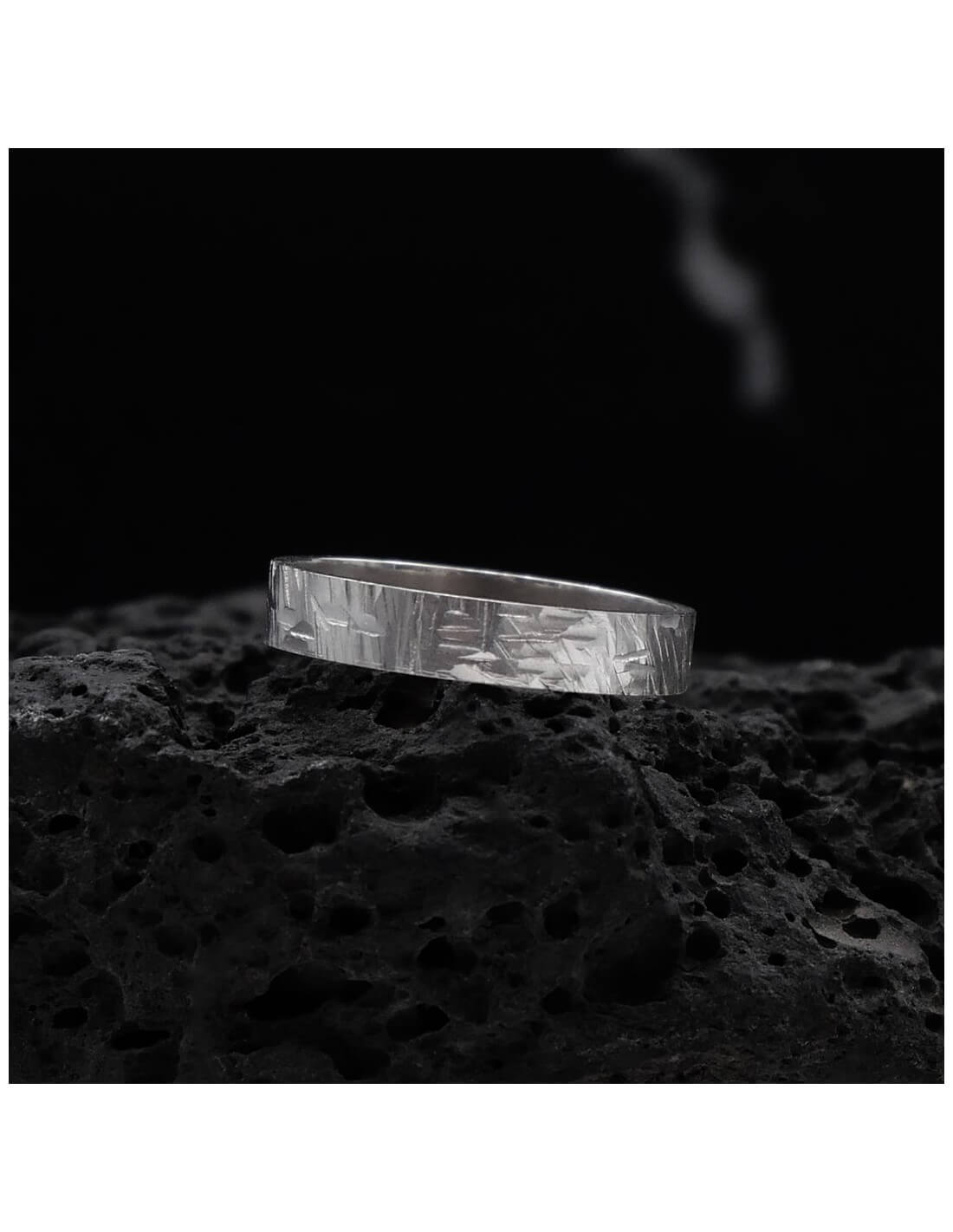 Majestueuse et singulière, l’alliance Encelade – L en or 18K se distingue par sa texture croisée, évoquant les lignes fracturées du satellite Encelade, aux pôles glacés et dynamiques. Le motif structuré, gravé à la main, donne un aspect géologique et céleste à la matière.