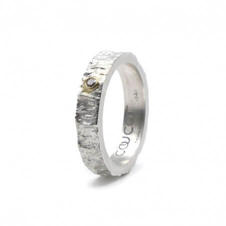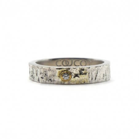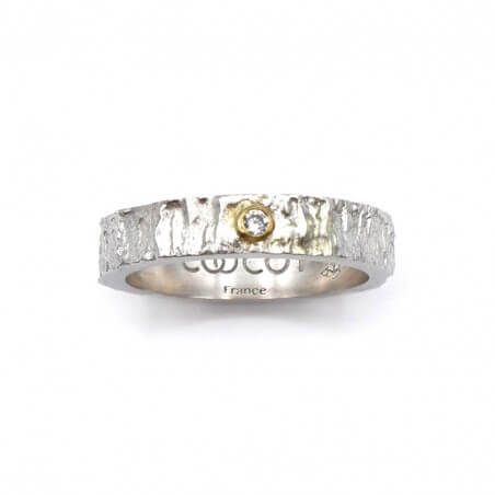 Cette alliance avec diamant incarne la modernité avec son élégant mélange d'argent et d'or jaune. Sa finition texturée, inspirée du bois à l'état brut, contraste harmonieusement avec l'éclat sophistiqué du diamant blanc .