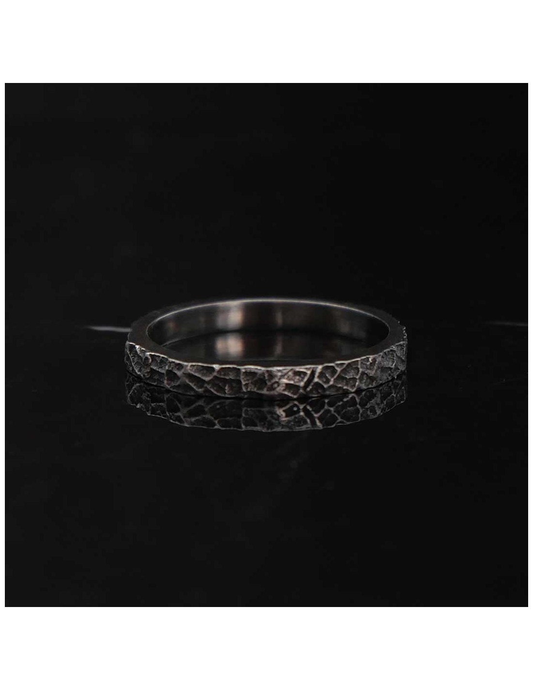 La fabrication de la Raphia repose sur des gestes artisanaux maîtrisés : les empreintes sont réalisées à la main à partir de matrices organiques, puis approfondies et finies par martelage et polissage sélectif. La patine révèle les creux et accentue le contraste entre zones mats et zones polies. Chaque alliance est unique — les variations de texture témoignent du caractère fait-main et de l’intimité du processus créatif. Portée, la Raphia évoque la poésie du vivant et la solidité d’un engagement durable.