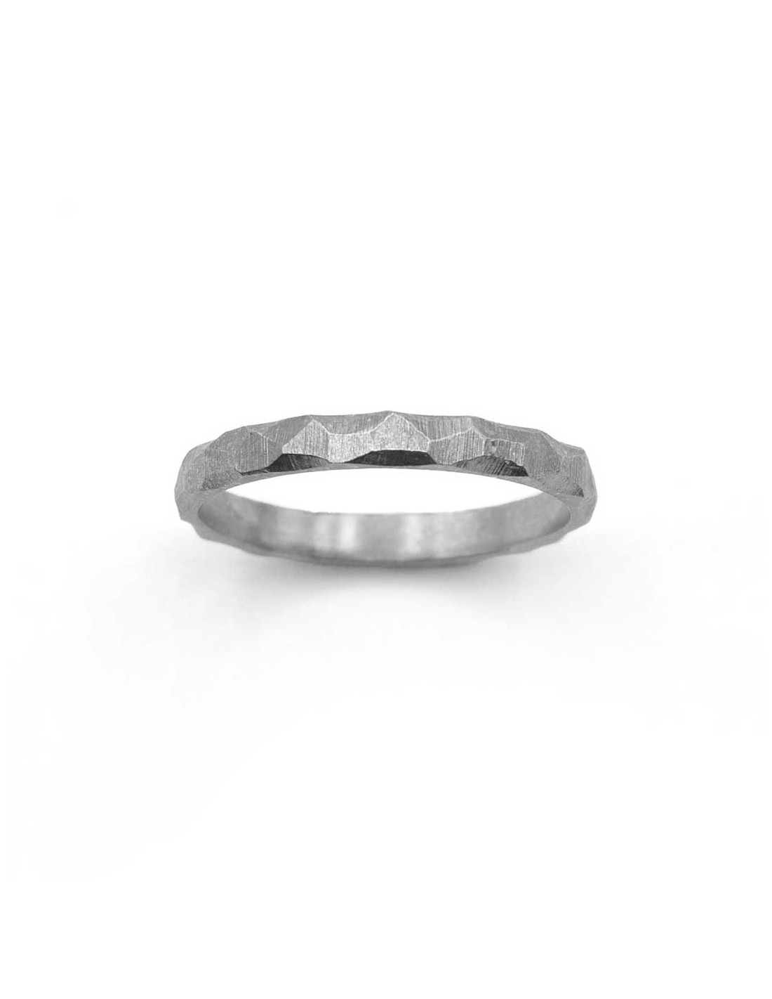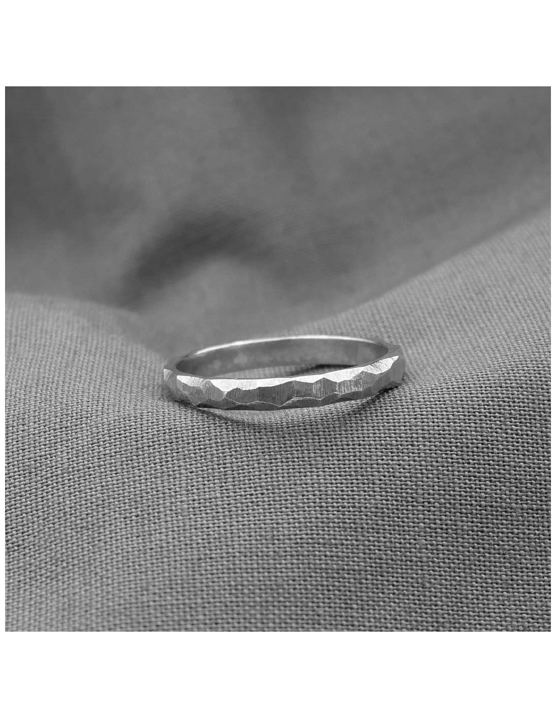 Chaque alliance Sylva est entièrement façonnée à la main dans notre atelier. Le métal est sculpté, martelé puis retravaillé pour révéler une surface facettée, presque minérale. La finition patinée vient souligner les creux et accentuer les contrastes entre zones mates et lumineuses, donnant à la bague toute sa profondeur. Aucune pièce n’est identique : les variations de texture font de chaque alliance une création unique, marquée par le geste de l’artisan.