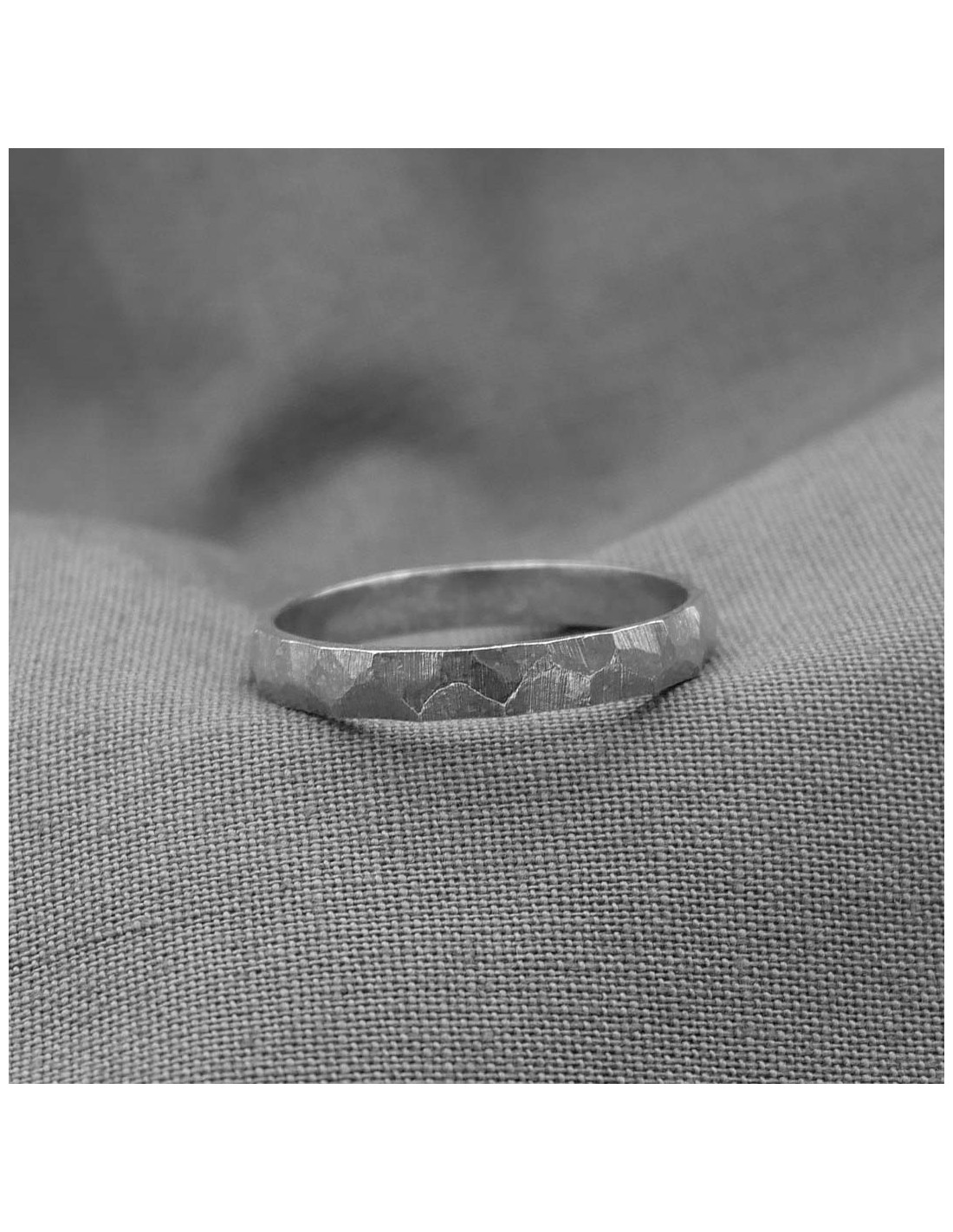 Chaque alliance est entièrement réalisée à la main dans notre atelier. Le métal est façonné, sculpté puis texturé pour obtenir une surface facettée unique. La finition, subtilement travaillée, révèle les reliefs et joue avec la lumière, accentuant les contrastes entre zones mates et brillantes. Chaque pièce est singulière, marquée par le geste et la sensibilité de l’artisan.