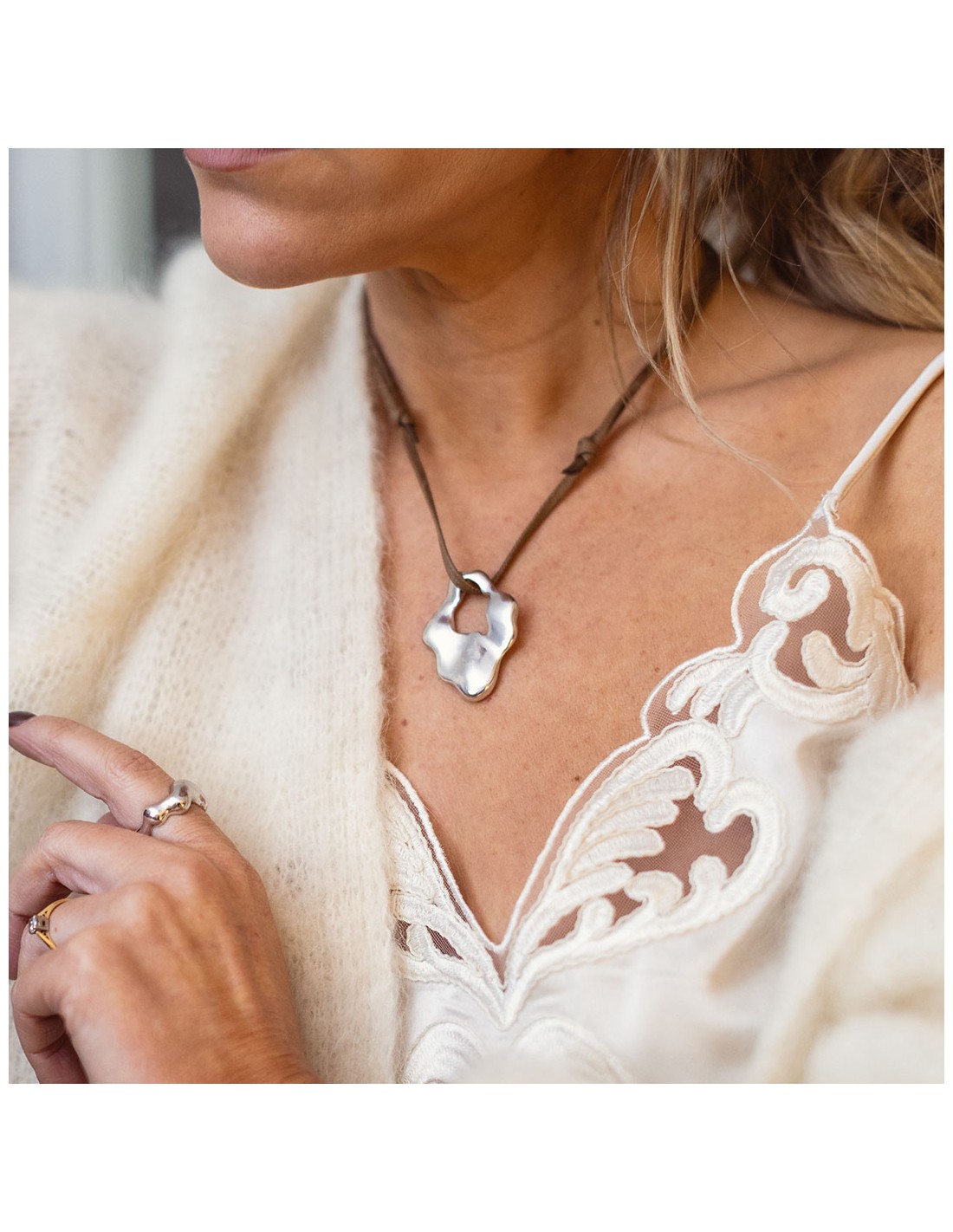 Le collier sautoir Halo allie élégance et modernité avec ses formes ondulantes sculptées à la main, inspirées des vagues. Ce modèle minimaliste se distingue par un cordon en coton ciré nude, rappelant la couleur du sable, apportant une touche subtile de nature. Parfait pour le quotidien ou des occasions spéciales, ce collier se porte avec une blouse ou une robe, créant une silhouette délicate et sophistiquée, tout en s’adaptant à chaque personnalité.