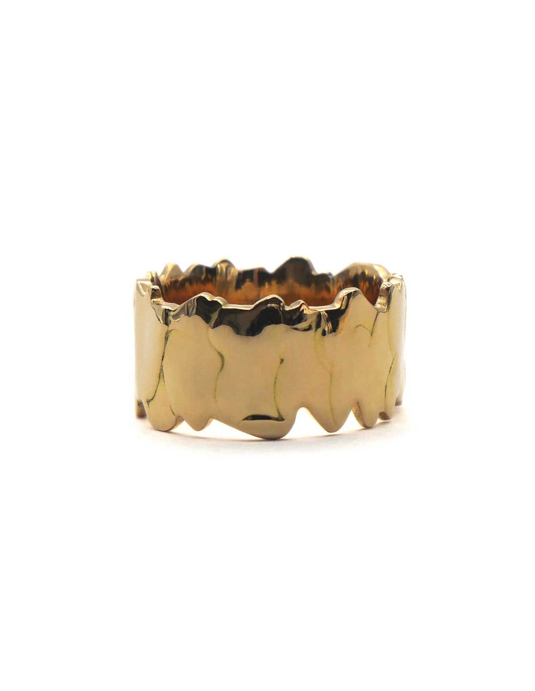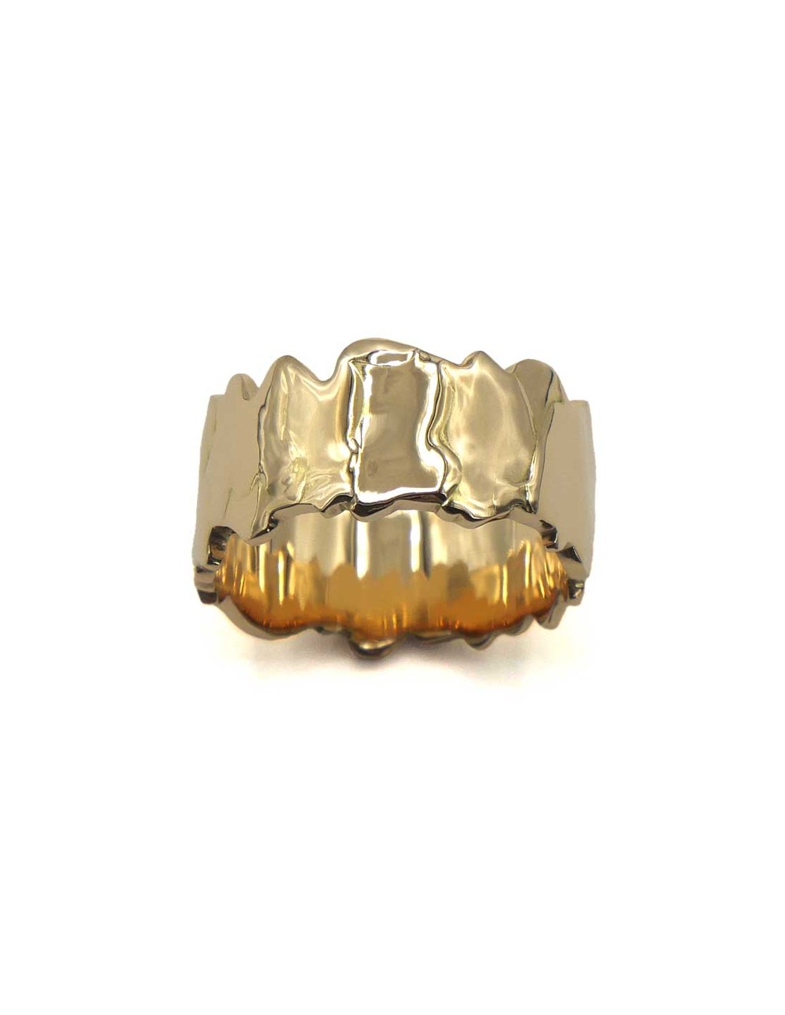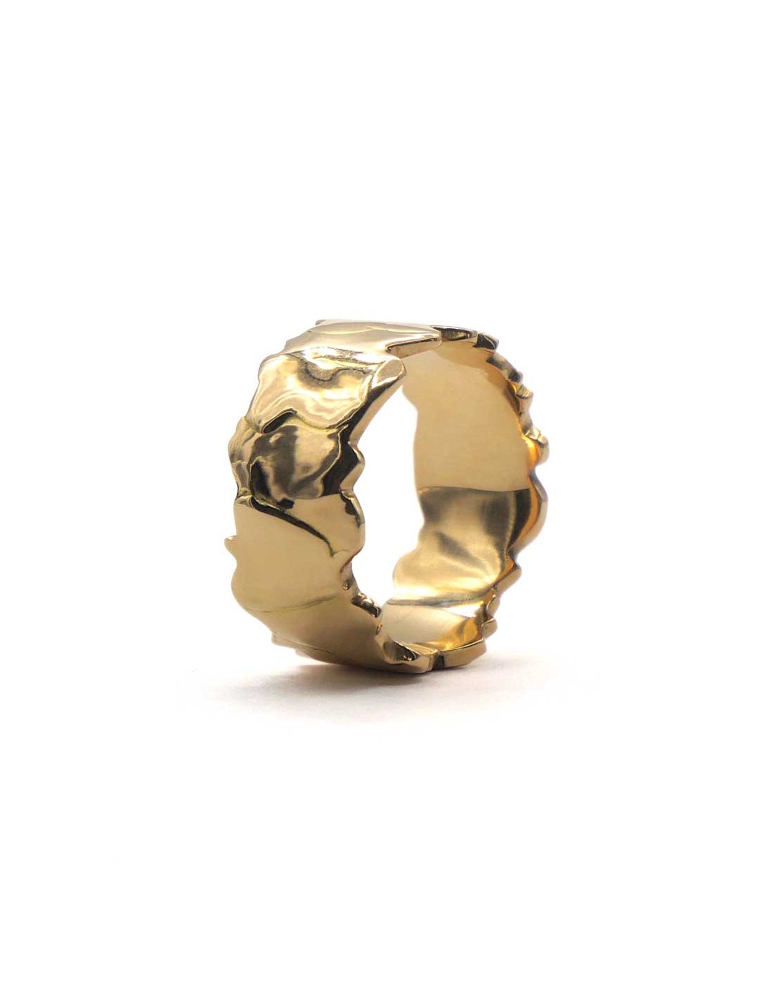 La bague moderne femme Hélios L séduit par son ampleur et sa texture organique, inspirée du métal en fusion. Ses reliefs irréguliers captent la lumière et soulignent la force du geste artisanal. Façonnée à la main en or 18k, cette création de 10 mm conjugue puissance et raffinement.