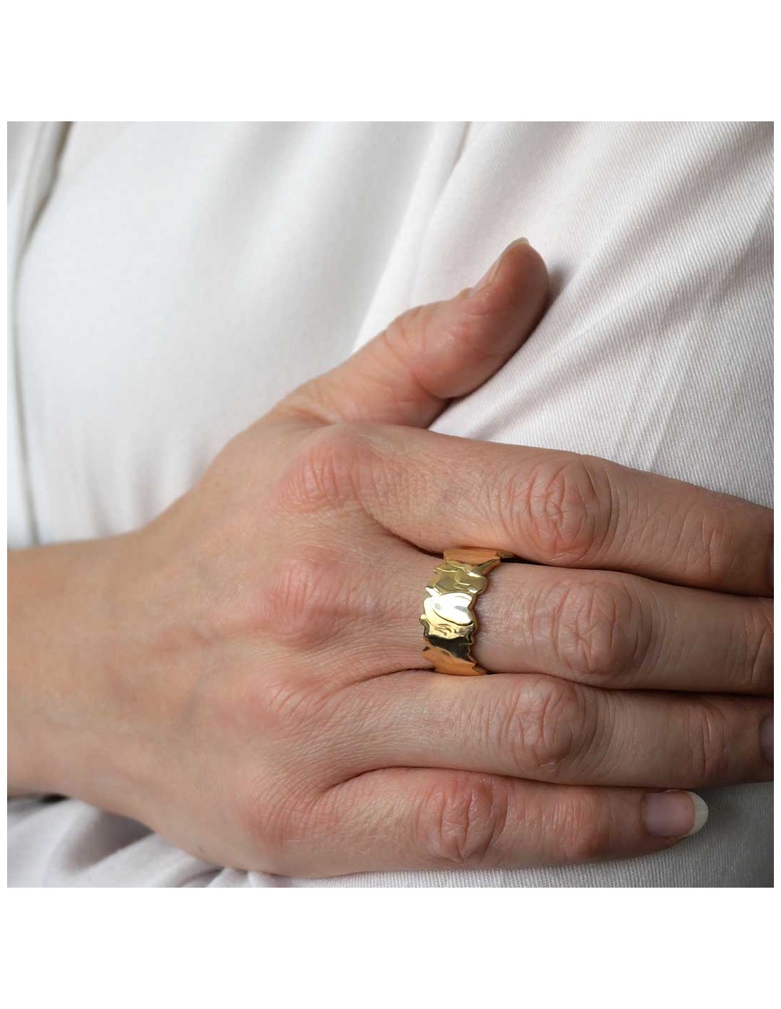Sculptée à la main dans la cire, puis fondue et minutieusement polie, chaque bague Hélios L est unique. Ses larges reliefs, ses creux aléatoires et ses courbes irrégulières dessinent une texture forte, charismatique, presque minérale. Ce bijou incarne une beauté affirmée et solaire — une bague manifeste, pensée pour les femmes libres, puissantes et lumineuses.