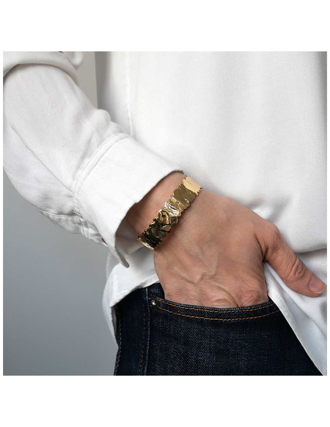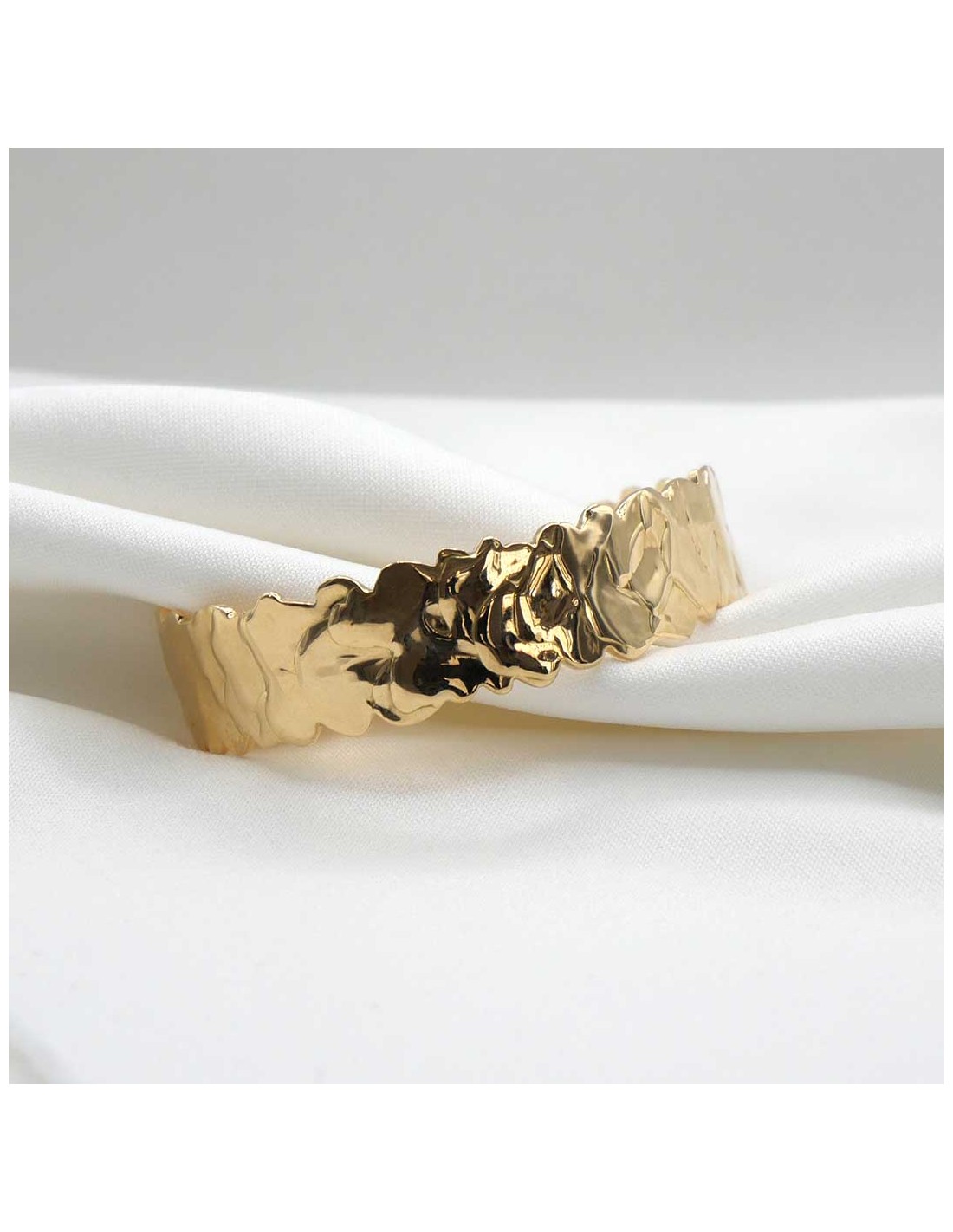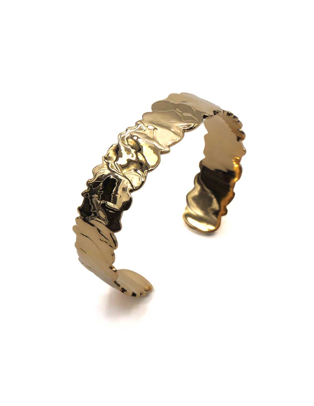 Pièce maîtresse de la collection Hélios, elle se distingue par sa texture organique, ses lignes libres et sa force expressive. Elle épouse le poignet avec douceur, tout en affirmant un style résolument contemporain. Telle une armure solaire, elle habille les femmes libres et lumineuses, en quête d’un bijou intemporel et chargé de sens.