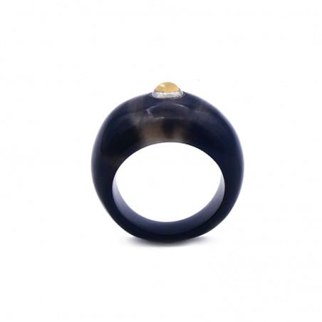 Cette bague en corne est surmontée d’une pierre ronde taillée en cabochon de diamètre 4 mm. La pierre fine apporte de l'éclat à la corne créant une intrigante et mystérieuse dualité. Faites votre choix parmi 9 pierres fines : des plus sombres aux plus lumineuses.