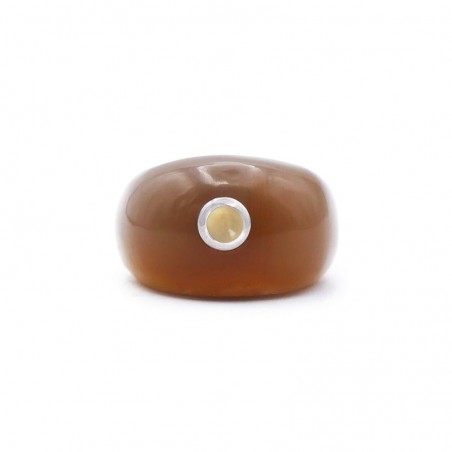 Cette bague en corne est surmontée d’une pierre ronde taillée en cabochon de diamètre 4 mm. La pierre fine apporte de l'éclat à la corne créant une intrigante et mystérieuse dualité. Faites votre choix parmi 9 pierres fines : des plus sombres aux plus lumineuses.