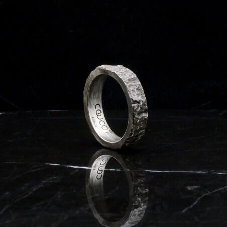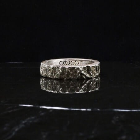 Cette alliance homme est travaillée avec un aspect de matière évoquant le bois à l'état brut. Le relief irrégulier et rugueux contrebalance avec la finition lisse des bords.