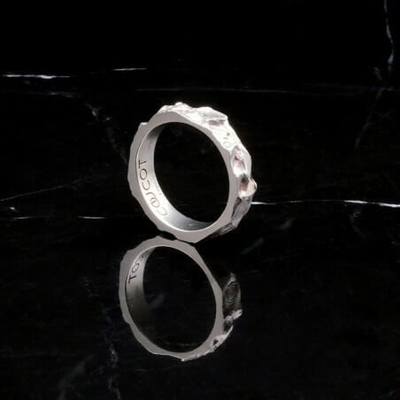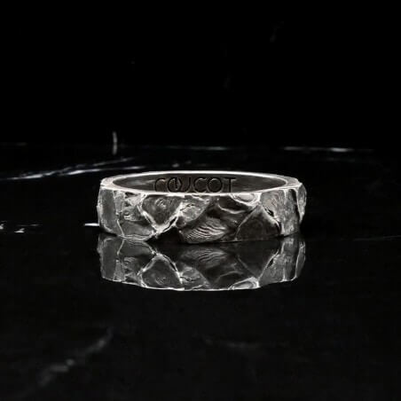 Cette alliance homme se distingue par son aspect de matière évoquant la glace à l'état brut. Le métal se cristallise en glace d'une préciosité fantastique et mystérieuse.