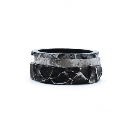 Ce stacker est un ensemble de trois anneaux travaillés avec un aspect de matière évoquant la glace à l'état brut alternant la finition vieillie et poli. Accumulez ces bagues ou portez-les de manière indépendantes. 25€ de remise pour l'achat de ce stacker.
