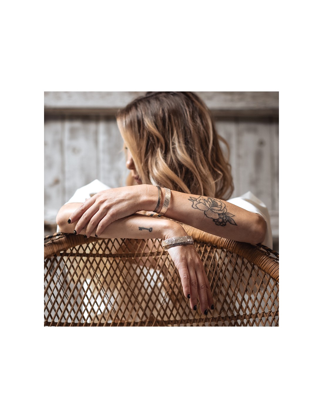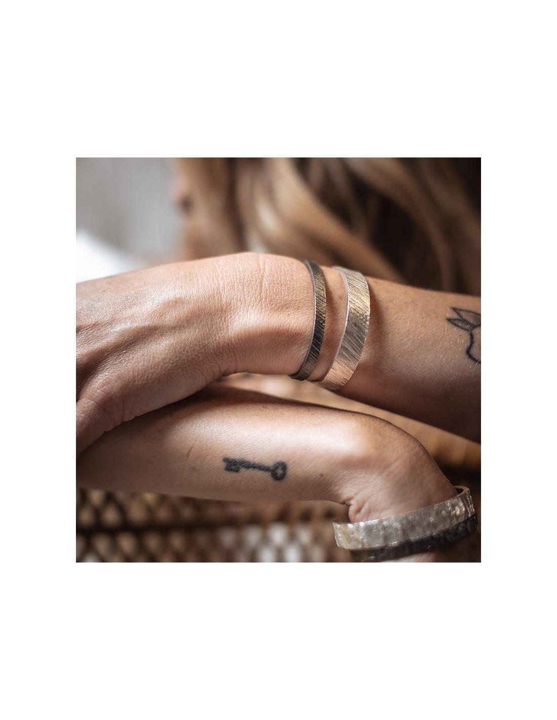 Cette manchette se distingue par son aspect de matière évoquant le métal à l'état brut. Le minéral se fige et se retranscris en des traits parfaits tels des strates mettant en lumières des lignes séduisantes.