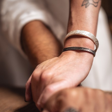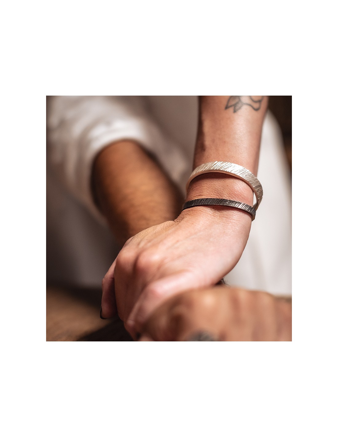 Cette manchette Tungst-N-S est fabriquée en petite série au sein de notre atelier lillois. Cette manchette est singulière et fait la différence en deux points : l'intégralité de sa fabrication est réalisée sur le sol français et par le travail de métal au travers des effets de matières évoquant les matières naturelles telles que le métal, le bois ou encore la glace.