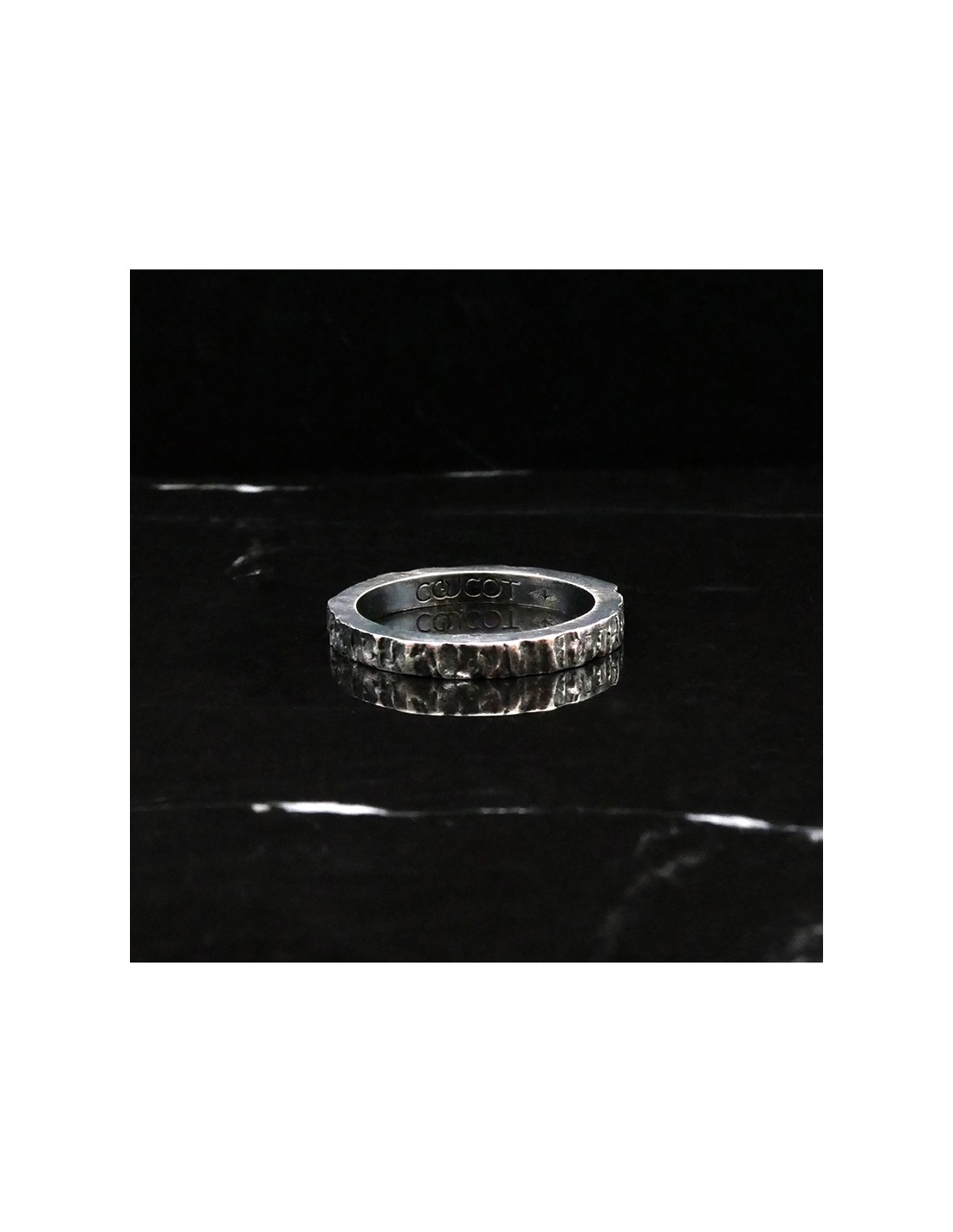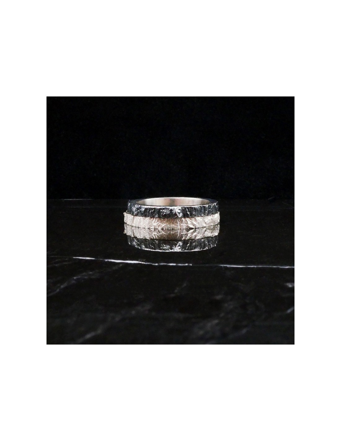 Photo sur fond marbre noir de l’alliance originale en argent modèle Hypérion finition vieillie.