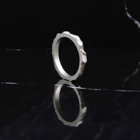 Cette alliance homme originale se distingue par son aspect de matière évoquant la glace à l'état brut. Le métal se cristallise et devient l'expression d'une préciosité fantastique et mystérieuse.