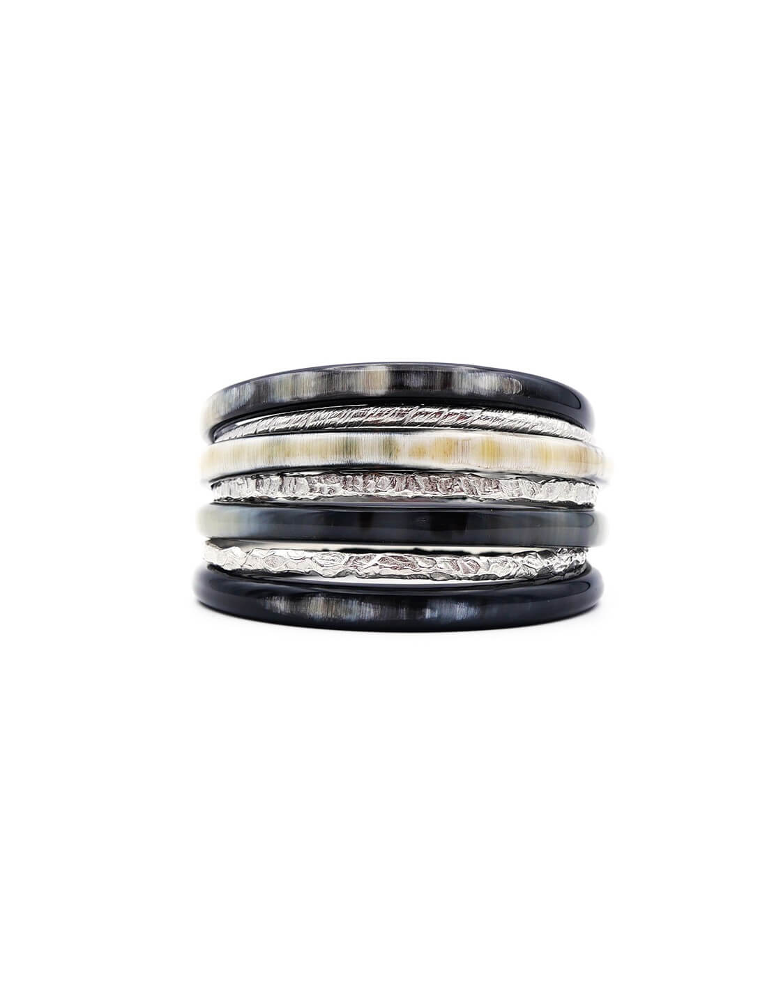 Ce jonc est travaillé avec un aspect de matière évoquant la glace à l'état brut comme une chaine de montagne. Associez ce jonc en argent avec d'autres joncs tel que les joncs en corne de la collection corne addict.