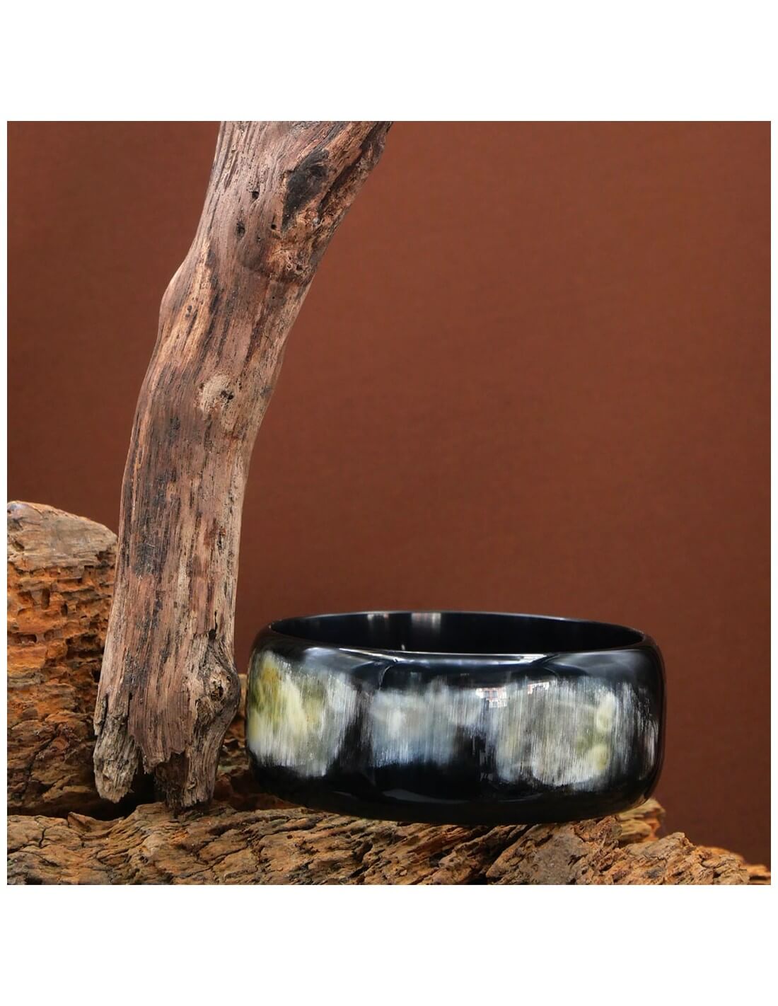 Taillé dans la corne, ce bracelet jonc est une pièce indémodable pour toutes les femmes désirant un bijou qui traverse les époques. Riche de ses couleurs naturelles et de ses formes généreuses, ce bracelet jonc est magnétique car on ne peut s'empêcher de le toucher.