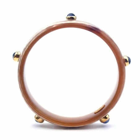 Ce généreux jonc en corne est surmonté de cinq pierres rondes taillées en cabochon de diamètre 6 mm. Ce jonc raffiné présente des pierres naturelles dans un heureux jeu de couleurs : des petites merveilles qui scintillent à chaque mouvement de bras. Faites votre choix parmi 9 pierres fines, des plus sombres aux plus lumineuses.