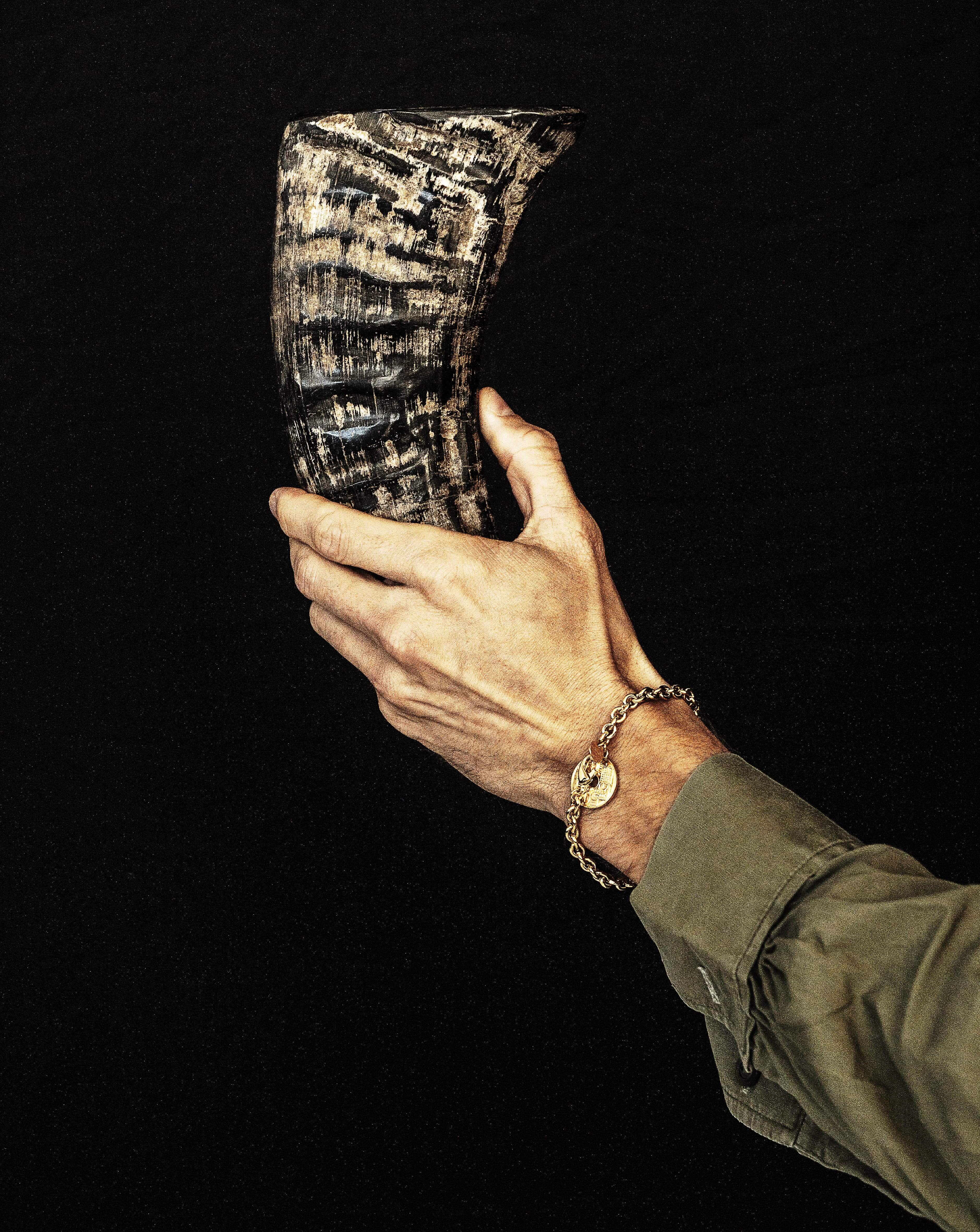 Photo d'un homme qui tient une choppe en corne, travail de la corne.
