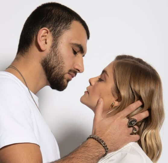 Photo d'un couple portant des bijoux en corne, travail de la corne.