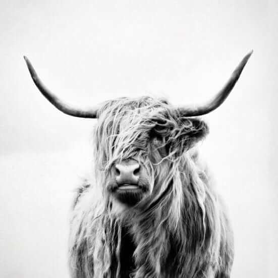 Photo d'une vache en noir et blanc, le travail de la corne.