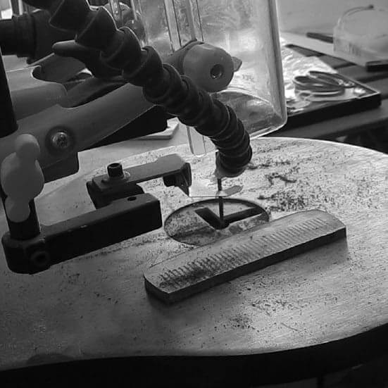Photo du travail de la corne, découpe d'une peigne en corne..