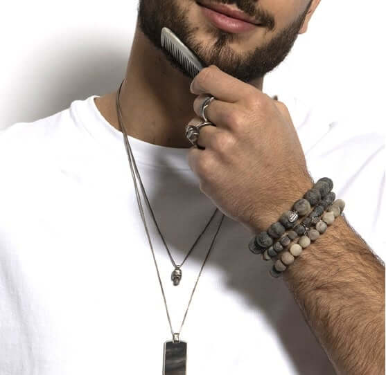 Photo d'un homme portant des bijoux en corne, travail de la corne.