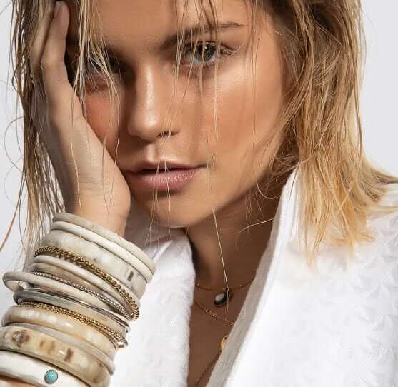 Photo d'une femme portant des bijoux en corne, travail de la corne.