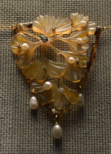 Collier Art Nouveau, avec un motif de feuilles de Ginkgo biloba. Corne, or, or émaillé, perles, brillants. France, vers 1900. Museum für Angewandte Kunst Köln.