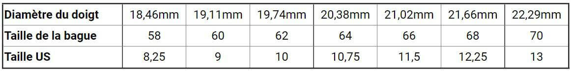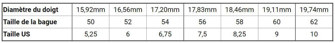 Tout d'abord, munissez-vous d'une bague vous allant parfaitement. Mesurez ensuite le diamètre de votre bague à l'aide d'une règle. Notez son diamètre en millimètres, et référez-vous au tableau ci-dessous pour trouver votre taille !